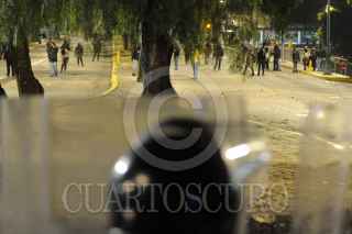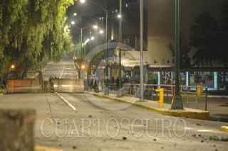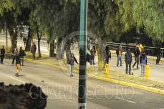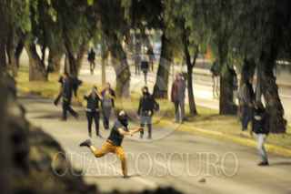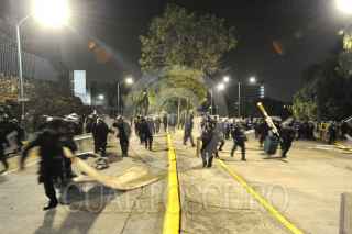 MÉXICO D.F., 16NOVIEMBRE2014.- Granaderos de la SSP del DF, retiraron el vehículo calcinado por estudiantes en C.U. Lo que provoco que estudiantes lanzaran piedras contra uniformados y destrozaran mobiliario interno. El lugar, fue resguardado por unos minutos para luego retirar la policía sus tropas. FOTO: LUIS CARBAYO /CUARTOSCURO.COM