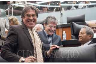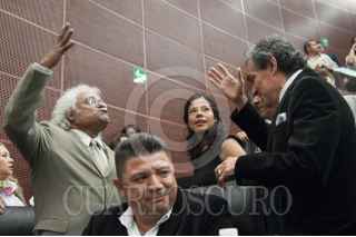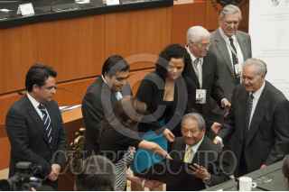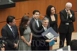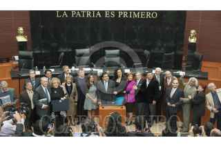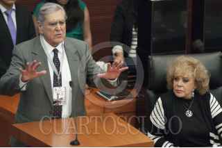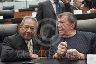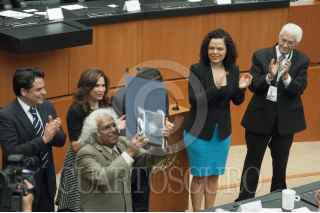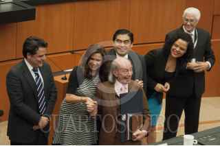 MÉXICO, D.F., 18NOVIEMBRE2014.- Eric Del Castillo, Benito Raúl Ibarra, Héctor Bonilla, Rogelio Guerra, Silvia Pinal, Amparo Garrido, Xavier López "Chabelo", Jacqueline Andere, José José, Manuel 'Loco' Valdés, Édgar Vivar, Pepe Bustos y Los Hermanos Carrión, acompañados de los senadores perredistas Zoé Robledo, Miguel Barbosa Huerta, la priísta Blanca Alcalá y la panista Mariana Gómez del Campo, se toman la foto después de los reconocimientos que otorgó el Senado de la República a dichos actores cuyo trabajo difunde la imagen y la cultura mexicana a nivel internacional. FOTO: DIEGO SIMÓN SÁNCHEZ /CUARTOSCURO.COM