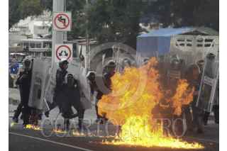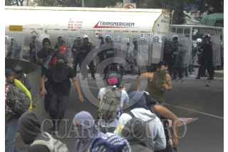 MÉXICO, D.F., 20NOVIEMBRE2014.- Se dió un enfrentamiento entre Policías y jóvenes embozados cuando éstos últimos intentaron realizaron bloqueos a los accesos del Aeropuerto Internacional de la Ciudad de México, los inconforme les aventaron piedras y bombas molotov a los granaderos quienes respondieron la agresión, una patrulla de la PGJDF resultó vandalizada y los granaderos detuvieron a varios manifestantes. FOTO: ARMAN MONROY /CUARTOSCURO.COM