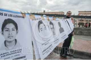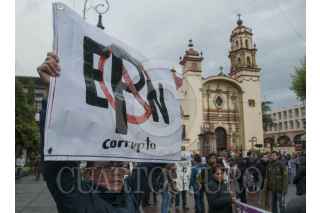 TOLUCA, ESTADO DE MÉXICO, 20NOVIEMBRE2014.- Estudiantes de la Universidad Autónoma del Estado de México y asociaciones civiles marcharon por las calles de la ciudad para conmemorar el 20 de noviembre y se solidarizaron por los 43 normalistas de Ayotzinapa desaparecidos. Con mantas y consignas llegaron al palacio municipal donde realizaron un mítin, colocaron veladoras y moños negros. FOTO: TONATIU CRUZ / CUARTOSCURO.COM
