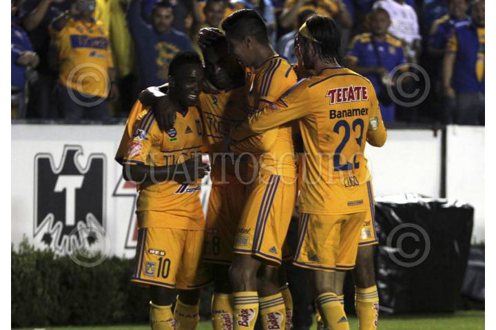 SAN NICOLAS DE LOS GARZA, NUEVO LEÓN, 22NOVIEMBRE2014.- Joffre Guarron del equipo de los Tigres de la UANL se disputa el balón con Alfredo Talavera portero del equipo del Toluca, en el estadio Universitario, partido correspondiente a la jornada 17 de la Liga MX, Apertura 2014. FOTO: GABRIELA PEREZ MONTIEL / CUARTOSCURO.COM