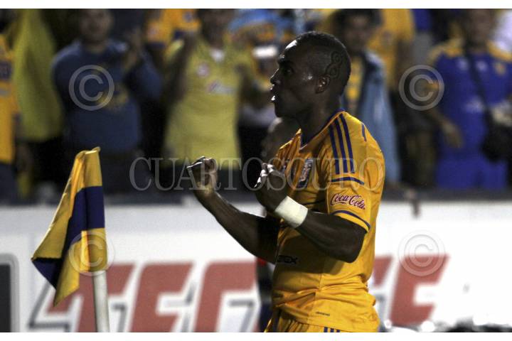 SAN NICOLAS DE LOS GARZA, NUEVO LEÓN, 22NOVIEMBRE2014.- Joffre Guarron del equipo de los Tigres de la UANL se disputa el balón con Alfredo Talavera portero del equipo del Toluca, en el estadio Universitario, partido correspondiente a la jornada 17 de la Liga MX, Apertura 2014. FOTO: GABRIELA PEREZ MONTIEL / CUARTOSCURO.COM