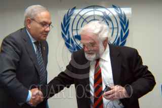 MÈXICO D.F. 09 MARZO.2006- Cristóbal Jaime Jáquez, Director General de la Comisión Nacional del Agua y Gordon Young, Coordinador Mundial de Evaluación de los Recursos Hídricos de la ONU (WWAP) durante la presentación mundial del 2o. Informe Civico Sobres el Desarrollo de Recursos Hídricos, en las intalaciones de la ONU en México. FOTO:Guillermo Perea / CUARTOSCURO.COM