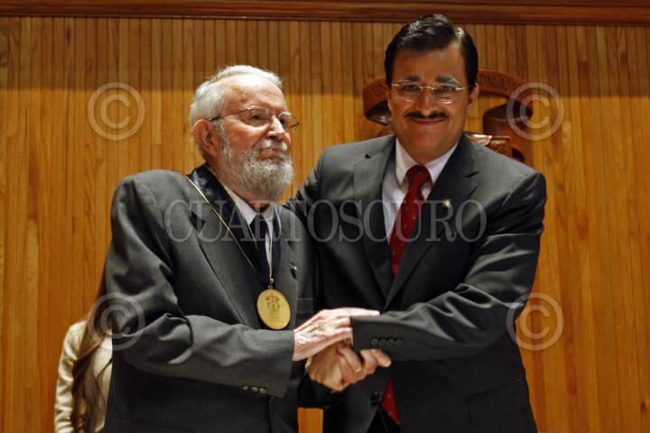 GUADALAJARA, JALISCO, 01DICIEMBRE2014.- Esta tarde en el Paraninfo de la Universidad de Guadalajara (U. de G.) y en el marco de la edición 28 de la Feria Internacional del Libro de Guadalajara 2014 (FIL), la Universidad de Guadalajara encabezada por el Rector Tonatiuh Bravo Padilla, reconoció con el Doctorado Honoris Causa al Poeta Hugo Gutiérrez Vega. FOTO: FERNANDO CARRANZA GARCIA / CUARTOSCURO.COM.