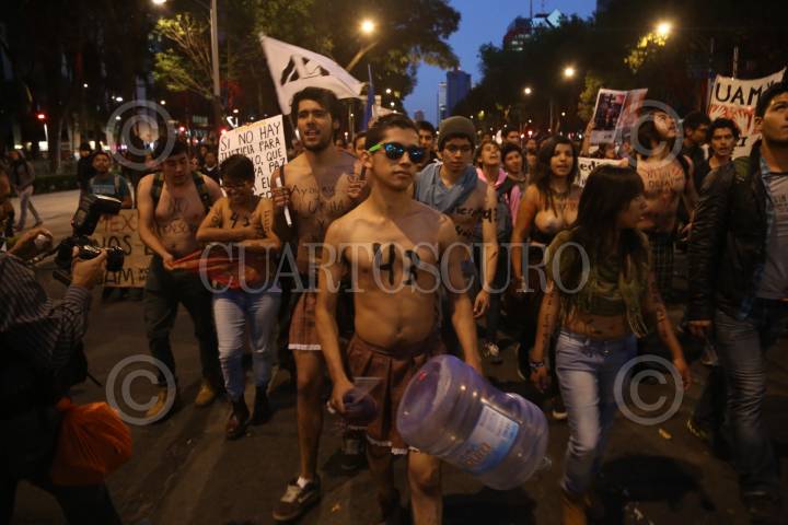 MÉXICO D.F. 01DICIEMBRE2014.- Integrantes de organizaciones sociales marcharon de zócalo de la Ciudad de México al Ángel de la Independencia en apoyo a los normalistas desaparecidos en Iguala Guerrero. En la imagen algunos manifestantes se enfrentaron com granaderos y resultaron heridos. FOTO SAÚL LOPEZ /CUARTOSCURO