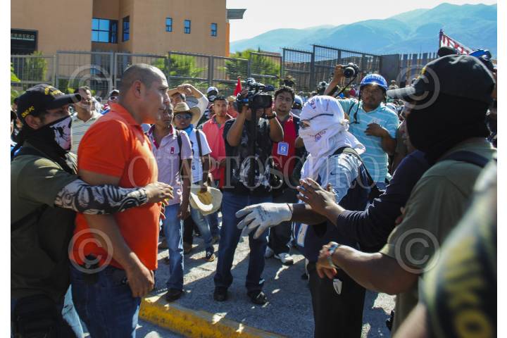 CHILPANCINGO, GUERRERO, 02DICIEMBRE2014.-Profesores de la CETEG, policía comunitaria de la CRAC, estudiantes de la normal de Ayotzinapa y padres de familia de los 43 estudiantes desaparecidos marcharon del parque Margarita Maza de Juárez hacia el palacio de gobierno del estado para conmemorar el 40 aniversario Luctuoso del profesor y guerrillero Lucio Cabañas Barrientos, así como, para exigir la presentación con vida de los 43 desaparecidos en Iguala, durante el trayecto increparon a los militares de la 35 zona, apedrearon el congreso, y finalmente un grupo desalojo a los trabajadores del palacio, mientras tanto pintaron su exigencias en el inmueble gubernamental. Los profesores fueron encarados por un hombre que salió del palacio y les reprocho su manera violenta de protestar por lo que hubo un pequeño forcejeó con el ciudadano que fue retado por un profesor cuando el primero les dijo son valientes por montoneros, al final la policía comunitaria puso orden. FOTOS: JOSÉ I. HERNÁNDEZ /CUARTOSCURO.COM