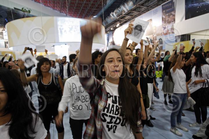 GUADALAJARA, JALISCO, 03DICIEMBRE2014.- Esta tarde dentro de las instalaciones de la Expo en donde se desarrolla la Feria Internacional del Libro de Guadalajara 2014 (FIL), un grupo de ciudadanos manifestó su repudio al gobierno en turno y a los hechos violentos sucedidos el pasado 26 de septiembre en Iguala Guerrero contra normalistas de Ayotzinapa. FOTO: FERNANDO CARRANZA GARCIA / CUARTOSCURO.COM