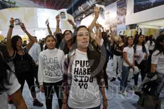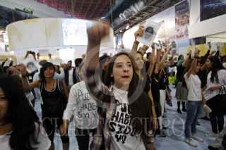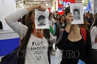 GUADALAJARA, JALISCO, 03DICIEMBRE2014.- Esta tarde dentro de las instalaciones de la Expo en donde se desarrolla la Feria Internacional del Libro de Guadalajara 2014 (FIL), un grupo de ciudadanos manifestó su repudio al gobierno en turno y a los hechos violentos sucedidos el pasado 26 de septiembre en Iguala Guerrero contra normalistas de Ayotzinapa. FOTO: FERNANDO CARRANZA GARCIA / CUARTOSCURO.COM