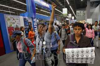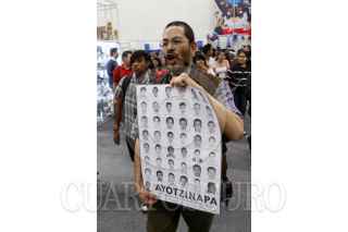 GUADALAJARA, JALISCO, 03DICIEMBRE2014.- Esta tarde dentro de las instalaciones de la Expo en donde se desarrolla la Feria Internacional del Libro de Guadalajara 2014 (FIL), un grupo de estudiantes recorrió los pasillos de la Feria, manifestando su repudio a los hechos violentos sucedidos el pasado 26 de septiembre en Iguala Guerrero contra normalistas de Ayotzinapa. FOTO: FERNANDO CARRANZA GARCIA / CUARTOSCURO.COM