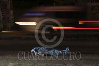 ECATEPEC, EDOMEX, 03DICIEMBRE2014.- Una mujer que vivía en condiciones de indigencia fue atropellada al intentar cruzar la transitada carretera Lecheria-Texcoco Colonia San Isidro Autlautenco. Policías Federales abanderaron el cuerpo en espera de Ministerio Publico del Municipio de Ecatepec. FOTO: DIEGO REYES /CUARTOSCURO.COM