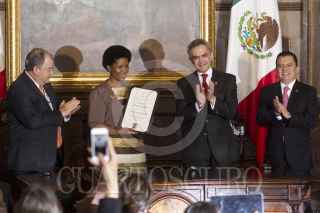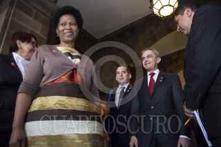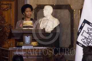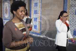 MEXICO, D.F., 05DICIEMBRE2014.- La secretaria general adjunta de la ONU y directora ejecutiva de ONU-Mujeres, Phumzile Mlambo-Ngcuka, reicibió el nombramiento de Visitante Distinguida de la Ciudad de México de manos de Miguel Angel Mancera, jefe de gobierno del Distrito Federal. Phumzile invitó a todos los hombres a trabajar en conjunto hacia la igualdad de género. En la imagen, Mlambo-Ngcuka camina junto a la secretaria de Desarrollo Social, Rosa Isela Rodríguez. FOTO: DAVID POLO /CUARTOSCURO.COM