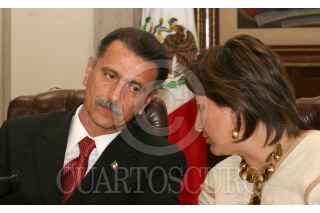 MÉXICO D.F. 10MARZO2006.- Carlos Abascal, secretario de Gobernación y Xòchitl Gàlvez Ruiz de la Comision Nacional para el Desarrollo de los Pueblos Indìgenas, durante la inauguraciòn de la Instalacion de la Comision Intersecretarial para los Festejos del Benemèrito del Natalicio de Don Bènito Juàrez. FOTO: Diego Gallegos/CUARTOSCURO.COM