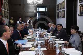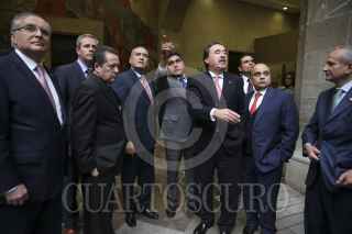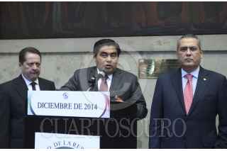 MÉXICO, D.F., 06DICIEMBRE2014.- Manlio Fabio Beltrones, Coordinador del PRI en la Camara de Diputados junto a Miguel Barbosa, Coordinador del PRD en el Senado de la República y Isabel Trejo, Coordinador del PAN en la Cámara de Diputados durante la conferencia que realizaron al termino de la reunión privada que mantuvieron para detallar la agenda legislativa en los siguientes dias. FOTO: CUARTOSCURO.COM