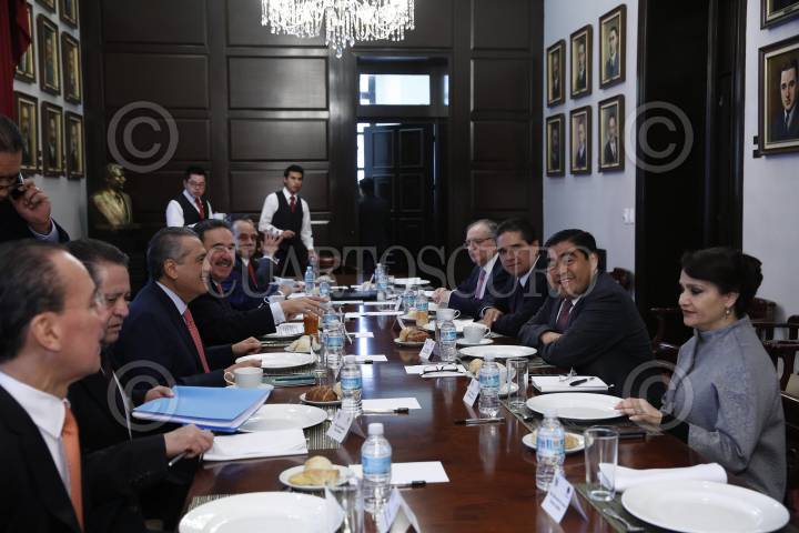 MÉXICO, D.F., 06DICIEMBRE2014.- Manlio Fabio Beltrones, Coordinador del PRI en la Camara de Diputados junto a Miguel Barbosa, Coordinador del PRD en el Senado de la República y Isabel Trejo, Coordinador del PAN en la Cámara de Diputados durante la conferencia que realizaron al termino de la reunión privada que mantuvieron para detallar la agenda legislativa en los siguientes dias. FOTO: CUARTOSCURO.COM
