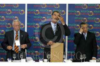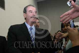 MEXICO, D.F., 10MARZO2006.- Alberto Nuñez Esteva, presidente de la COPARMEX, Vicente Fox Quesada, Presidente de la República y Francisco Javier Salazar, Secretario de Trabajo, al término de la comida con motivo de la clausura del 1er. foro regional Impulsando el Desarrollo Regional", en el Centro Banamex. FOTO: Moisés Pablo/CUARTOSCURO.COM