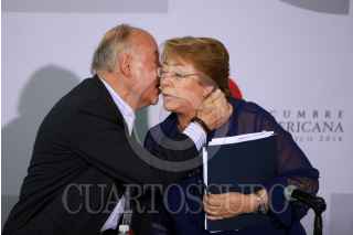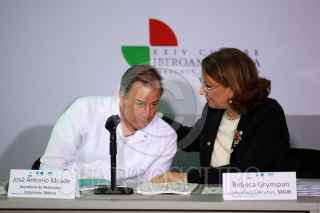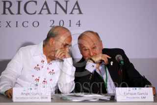 BOCA DEL RÍO, VERACRUZ., 09DICIEMBRE2014.- Jose Antonio Meade, Secretario de Relaciones Exteriores, Rebeca Grynspan, Secretaria de SEGIB, Juan Manuel Santos, presidente de Colombia, Alicia Bárcena, Secretaria de CEPAL, Ángel Gurria, secretario de la OCDE, Enrique García, presidente general de CAF, Michelle Bachelet, presidenta de Chile y Luis Alberto Moreno, presidente general del BID, participaron en el foro "Perspectivas Económicas de América Latina 2015" durante la XXIV Cumbre Iberoamericana. FOTO: FÉLIX MÁRQUEZ / CUARTOSCURO.COM