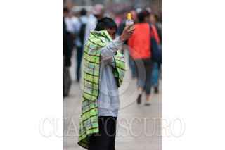 MÉXICO, D.F., 10DICIEMBRE2014.- Un indigente camina por las calles del centro histórico con su cobija verde y una botella con alcohol para evitar el frío. Decenas de capitalinos salen a las calles abrigados debido a las bajas temperaturas que se sienten en gran parte de la ciudad. FOTO: DIEGO SIMÓN SÁNCHEZ /CUARTOSCURO.COM