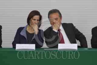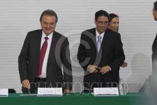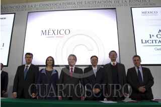 MÉXICO, D.F., 11DICIEMBRE2014.- Pedro Joaquín Codwell, titular de la Secretaria de Energía, encabezo el anuncio de la Primera Convocatoria de Licitación de la Ronda Uno, donde se establecen las base y modelos de contrato para exploración y extracción de Hidrocarburos. Los operadores que participen en la primera convocatoria de licitación de la Ronda Uno estarán obligados a demostrar capacidad técnica y financiera, lo que significará una forma de blindaje para la licitación. Durante la ceremonia de el secretario fue acompañado de Jorge Rogelio Garza y Garza, subsecretario de Industria y Comercio, Lourdes Melgar Palacios, subsecretaria de Hidrocarburos, Juan Carlos Zepeda Molina, Comisiona Presidente de CNH, Miguel Messmacher Linartas, subsecretario de ingresos y Carlos Regules Ruiz Funes, Director General de ASEA. FOTO: GUILLERMO PEREA /CUARTOSCURO.COM