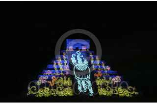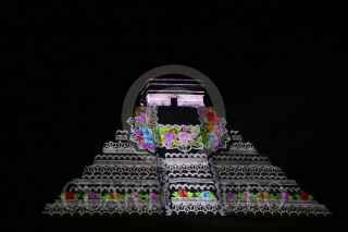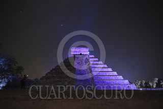 CHICHÉN ITZA, YUCATÁN, 11DICIEMBRE2014.- Aspectos del nuevo luz y sonido en la zona arqueológica de Chichén Itzá. Un total de siete proyectores de alta definición iluminan con diversos colores e imágenes en movimiento una parte de la pirámide de Kukulcán para mostrar en su superficie la historia de Chichén Itzá. FOTO: FRANCISCO BALDERAS /CUARTOSCURO.COM