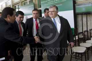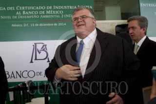 MÉXICO, D.F., 15DICIEMBRE2014.- Agustín Cartens Cartens, Gobernador del Banco de México, recibió de manos de Juan José Guerra Abud Secretario del Medio Ambiente y Recursos Naturales, el “Certificado de Industria Limpia”, que fue otorgado al Banco Central, en el complejo Legaria, Fábrica de Billetes del Banco de México. FOTO: GUILLERMO PEREA /CUARTOSCURO.COM
