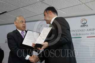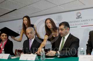 MÉXICO, D.F., 16DICIEMBRE2014.- Carlos Ponce Beltrán, director general de la Asociación Mexicana de Internet AMIPCI y César Martínez Baranda, director general de Fonacot, firmaron un convenio con la Asociación Mexicana de Internet, para para difundir los beneficios del crédito FONACOT y promover la afiliación de empresas al Instituto utilizando las modernas tecnologías de comunicación, en el marco de sus 40 años de creación. FOTO: MOISÉS PABLO /CUARTOSCURO.COM