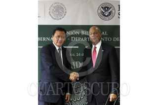 MÉXICO, D.F., 16DICIEMBRE2014.- Miguel Ángel Osorio Chong, secretario de Gobernación, y Jeh Johnson, secretario del Departamento de Seguridad Interna de Estados Unidos, sostuvieron hoy una reunión en la que reconocieron que el actual es uno de los mejores momentos en la historia de la relación México-Estados Unidos. Además, destacaron la colaboración existente para encontrar soluciones a los problemas comunes. FOTO: CUARTOSCURO.COM