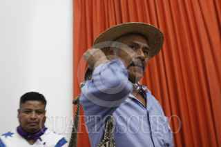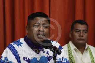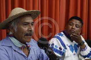 MÉXICO, D.F., 17DICIEMBRE2014.- Julián López Canaré, delegado por el Consejo Indígena Nayeri y Ubaldo Valdez, Consejo Regional Wixárika por la defensa de Wirikuta, denunciaron la violación de los derechos de los pueblos Náyeri y Wixárica en la construcción de la presa Las Cruces y las mineras en Wirikuta. Denuncian que la Conagua y la Comisión Federal de Electricidad están haciendo consultas a modo para validar el proyecto hidroeléctrico de la Cruces y la presa de La Maroma que forman parte de la infraestructura de los proyectos mineros en Wirikuta, las comunidades son objetos de presión y manipulación de la información, condicionando apoyos federales y estatales e incitando a la división y la confrontación social. por ejemplo en el caso de la presa La Maroma, la Conagua ha mentido al afirmar que este proyecto proyecto hidráulico se ubica a varios kilómetros de nuestros sitios sagrados, siendo que el embalse en realidad se encontraría totalmente dentro del Área Natural Protegida de Wirikuta. FOTO: MOISÉS PABLO /CUARTOSCURO.COM
