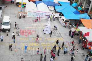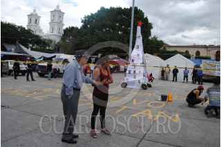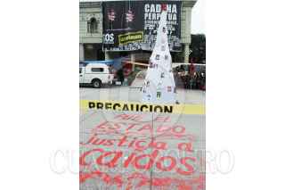 CHILPANCINGO, GUERRERO, 24DICIEMBRE2014.- Profesores de la Coordinadora Estatal de Trabajadores de la Educación Guerrero, que están en plantón en el zócalo de esta ciudad, colocaron un pino decorado con las fotografías de los estudiantes desaparecidos en Iguala y escribieron la leyenda “No hay Navidad ni Año Nuevo, porque nos faltan 43". FOTOS: JOSÉ I. HERNÁNDEZ /CUARTOSCURO.COM