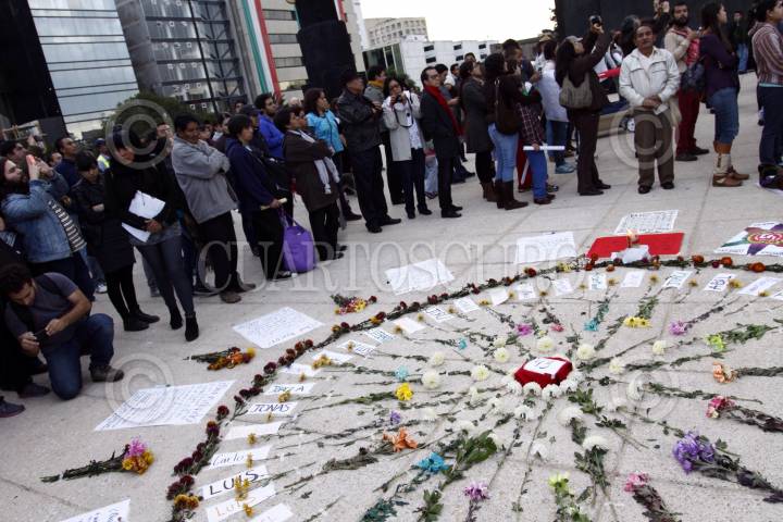 MÉXICO, D.F., 26DICIEMBRE2014.- Cientos de personas se reunieron en el Ángel de la independencia para manifestarse en apoyo a los familiares de los 43 estudiantes desaparecidos de Ayotzinapa, al finalizar, se realizo un mitin en el Monumento a la Revolución, donde los padres dieron su mensaje exigiendo al gobierno federal por la aparición con vida de sus hijos. FOTO: RASHIDE FRIAS / CUARTOSCURO.COM