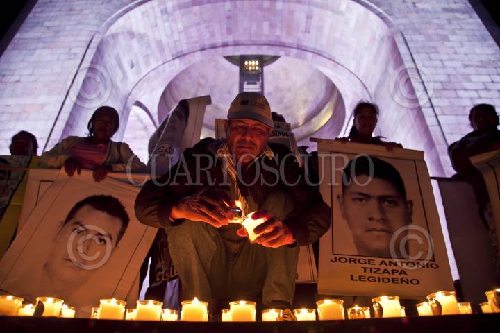 MÉXICO, D.F., 26DICIEMBRE2014.- Cientos de personas se reunieron en el Ángel de la independencia para manifestarse en apoyo a los familiares de los 43 estudiantes desaparecidos de Ayotzinapa, al finalizar, se realizo un mitin en el Monumento a la Revolución, donde los padres dieron su mensaje exigiendo al gobierno federal por la aparición con vida de sus hijos. FOTO: RASHIDE FRIAS / CUARTOSCURO.COM
