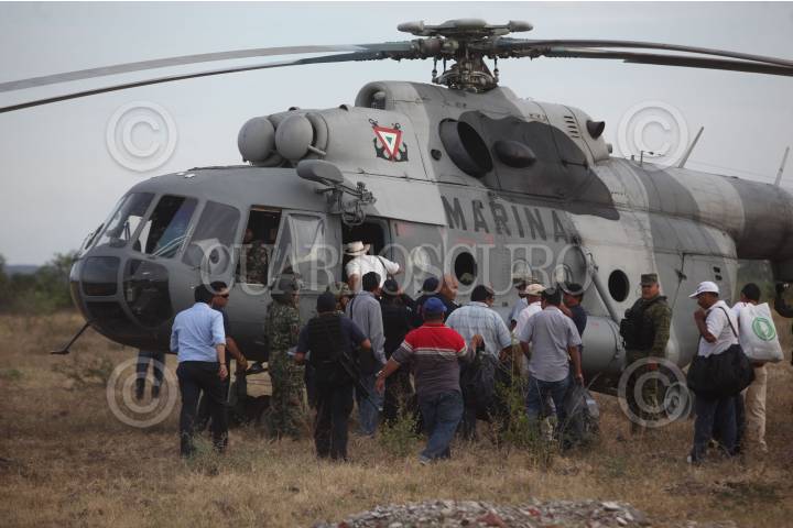 FELIPE CARRILLO PUERTO, MICHOACÁN, 27DICIEMBRE2014.- 27 elementos de la Fuerza Rural comandados por Hipólito Mora, se presentaron voluntariamente el día de hoy ante la justicia, un helicóptero de la Policía Federal y otro de la MARINA los trasladó a la ciudad de Morelia. FOTO: ALAN ORTEGA / CUARTOSCURO.COM