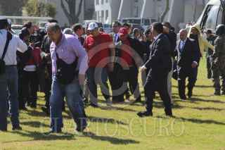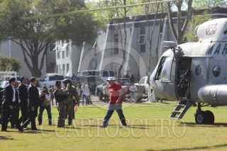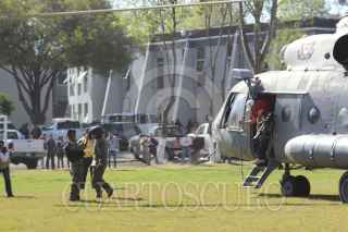 MORELIA, MICHOACÁN, 3ODICIEMBRE2014.- Luis Antonio Torres “El Americano” llegó hace unos minutos a Morelia en un helicóptero de la Marina Armada de México, tripulado también por el procurador general de Justicia del Estado, José Martín Godoy Castro y nueve de sus hombres, con quienes se entregó esta mañana a la justicia, en Buenavista Tomatlán. La aeronave aterrizó en las instalaciones de la Procuraduría General de Justicia del Estado únicamente para que descendieran Luis Antonio Torres y sus nueve hombres e inmediatamente fueron subidos a un camión suburbano que los trasladó al Cereso “David Franco Rodríguez” conocido como Mil Cumbres, donde serán puestos a disposición del juez que los reclama. FOTO: JUAN JOSÉ ESTRADA SERAFÍN /CUARTOSCURO.COM