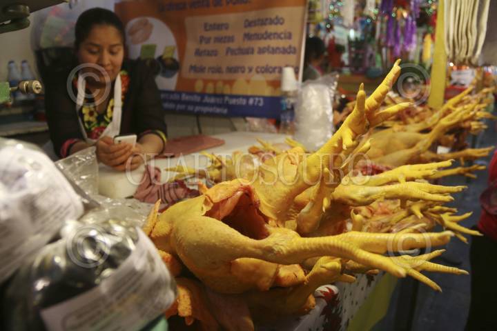 OAXACA, OAXACA, 30DICIEMBRE2014.- Para la cena de año nuevo la venta de pollo se ha incrementado ante los altos costos de otros productos, en el mercado Benito Juárez de la ciudad de Oaxaca el costo es de entre 60 y 75 pesos el kilogramo. Las ventas han ido en aumento aseguran los vendedores quienes esperan que que para este 31 de diciembre aumente más la demanda. FOTO: ARTURO PÉREZ ALFONSO /CUARTOSCURO.COM