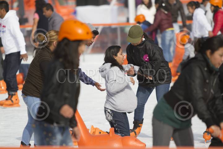 MÉXICO, D.F., 31DICIEMBRE2014.- Capitalinos acudieron al Zócalo donde se instalaron tres pistas de hielo; dos circulares, con diámetro de 25 metros, una para niños de 3 a 5 años de edad y otra para adultos mayores y personas con discapacidad, además de la pista central de 72 metros de largo por 35 de ancho, es decir, dos mil 196 metros cuadrados. FOTO: IVÁN STEPHENS /CUARTOSCURO.COM