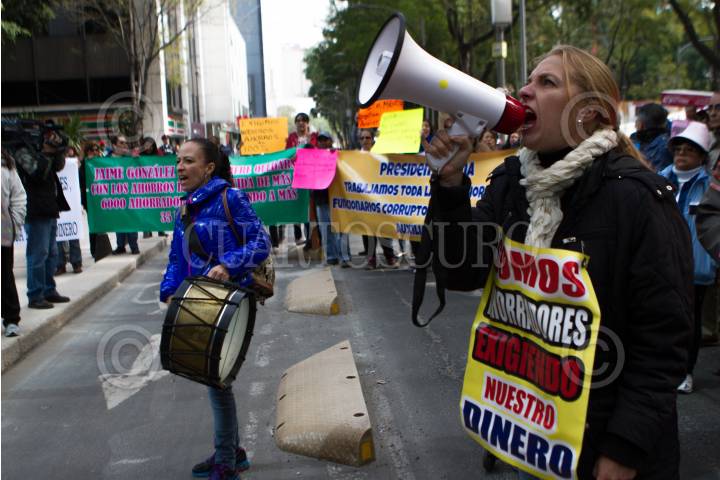 MÉXICO, D.F., 06ENERO2015.- Ahorradores defraudados por la sociedad financiera popular Ficrea acudieron a la Procuraduría General de la República (PGR) a exigir la captura de Rafael Olvera Amezcua, principal socio de Ficrea. La exigencia se hizo en una reunión luego de que funcionarios de la dependencia aceptaron recibir a una comisión de los ahorradores. Cientos de defraudados se manifiestaron afuera de las instalaciones de la PGR para pedir a las autoridades que se castigue a los responsables del desfalco de los ahorros que depositaron en la sociedad financiera popular (SOFIPO) acusada de desvío de recursos. Los manifestantes reclaman que a dos meses de la intervención gerencial a Ficrea no haya alguna orden de captura hacia Olvera Amezcua. FOTO: IVÁN STEPHENS /CUARTOSCURO.COM