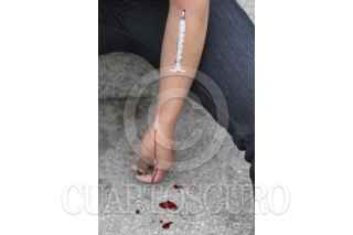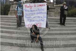 MÉXICO, D.F., 06ENERO2015.- Una mujer se extrajo sangre con una jeringa en las escalinatas del ángel de la independencia en protesta por la desaparición de los normalistas desaparecidos en Iguala Guerrero. FOTO: SAÚL LÓPEZ /CUARTOSCURO.COM