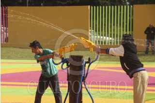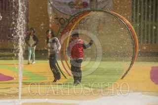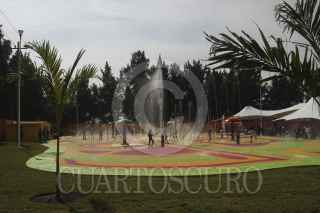 MÉXICO, D.F., 06ENERO2015.- Se inauguró hoy en Coyoacán el Parque Acuático Cherokees, en el cual se invirtieron casi 10 millones de pesos, esta atracción será gratuita para cualquier persona que cuenta con 4 hongos de fibra de vidrio que funcionan como cascadas, una pequeña área verde, 4 estaciones con pistolas de agua y dos atracciones más, los asistentes tendrán servicio de vestidores y sanitarios. FOTO: ISABEL MATEOS /CUARTOSCURO.COM