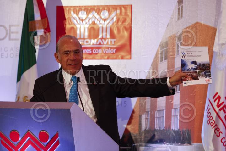 MÉXICO, D.F., 06ENERO2015.- José Ángel Gurría, secretario general de la Organización para la Cooperación y el Desarrollo Económicos, Alejandro Murat Hinojosa, director del Infonavit, y Miguel Ángel Mancera, Jefe de Gobierno, durante la presentación del estudio "Resultados del estudio de Política Urbana nacional de la OCDE" en el auditorio del Infonavit. FOTO: MOISÉS PABLO /CUARTOSCURO.COM