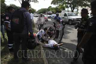 VILLAHERMOSA, TABASCO, 07ENERO2015.- Un joven motociclista que iba conduciendo a exceso de velocidad, se impactó contra un auto en movimiento sobre el bulevar Adolfo Ruiz Cortinez a la altura del fraccionamiento Bonanza. Los socorristas de la benemérita Cruz Roja prestan los primeros auxilios al conductor que resulto con diversas fracturas y lesiones que ponen en riesgo su vida. FOTO: MARCO POLO GUZMÁN HERNÁNDEZ /CUARTOSCURO.COM