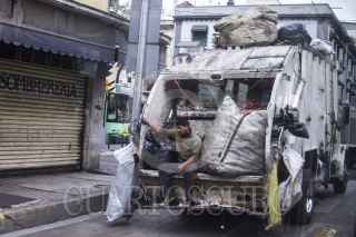 MÉXICO, D.F., 08ENERO2014.- Un joven recolector de basura viaja en la parte trasera del camión por las calles de la ciudad. FOTO: ENRIQUE ORDÓÑEZ /CUARTOSCURO.COM