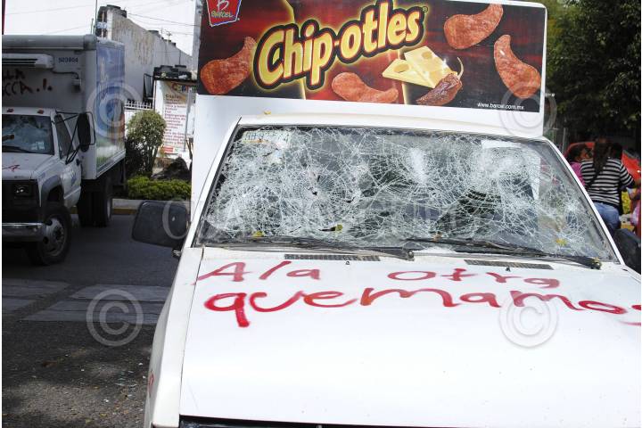 CHILPANCINGO, GUERERRO, 08ENERO2015.-Egresados que integran el Frente Único de Normales Publicas de Estado de Guerrero (Funpeg) fueron a las oficinas de la Secretaria de Educación Guerrero (SEG) antes ex Ineban, impactaron una camioneta contra la puerta principal un automotor lo atravesaron en la avenida Ruffo Figueroa uno más quedo en la entrada con la leyenda “ A la otra quemamos” en otra más se leía renuncia Secretario, Refiriéndose al titular de la SEG Salvador Martínez della Roca; usted rompió los acuerdos nosotros rompemos el nuestro. FOTO: JOSÉ I. HERNÁNDEZ /CUARTOSCURO.COM
