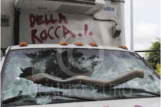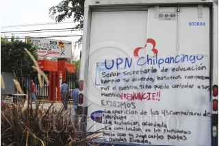 CHILPANCINGO, GUERERRO, 08ENERO2015.-Egresados que integran el Frente Único de Normales Publicas de Estado de Guerrero (Funpeg) fueron a las oficinas de la Secretaria de Educación Guerrero (SEG) antes ex Ineban, impactaron una camioneta contra la puerta principal un automotor lo atravesaron en la avenida Ruffo Figueroa uno más quedo en la entrada con la leyenda “ A la otra quemamos” en otra más se leía renuncia Secretario, Refiriéndose al titular de la SEG Salvador Martínez della Roca; usted rompió los acuerdos nosotros rompemos el nuestro. FOTO: JOSÉ I. HERNÁNDEZ /CUARTOSCURO.COM