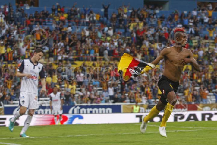 GUADALAJARA, JALISCO, 11ENERO2015.- En la imagen Fidel Martínez, festeja su anotación durante el juego entre Leones Negros de la Universidad de Guadalajara y el equipo de Monterrey, en partido correspondiente a la Jornada 1 del Torneo Clausura 2015 de la Liga MX en donde los Leones Negros vencieron un gol a cero a los Rayados de Monterrey. FOTO: FERNANDO CARRANZA GARCIA / CUARTOSCURO.COM