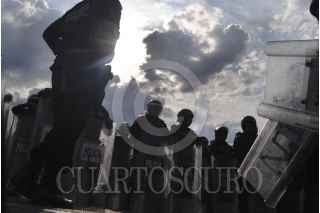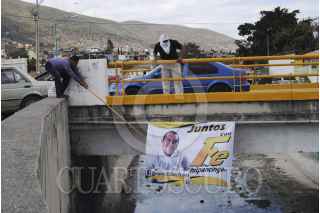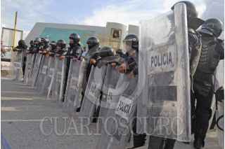CHILPANCINGO, GUERERO, 16ENERO2014.- Profesores de la Coordinadora Estatal de Trabajadores de la Educación en Guerrero (Ceteg) iniciaron labores de limpieza de propaganda electoral en todo el acotamiento del Rio Huacapa, al llegar a las instalaciones de la SNTE, quebraron los vidrios y realizaron pintas. Al lugar llegaron policías estatales con equipo antimotines, los manifestantes se retiraron en sus camionetas al verlos, sin embargo los policías los siguieron y en Aurrera ubicada al norte de la ciudad, detuvieron a dos maestros. FOTO: JOSÉ I. HERNÁNDEZ / CUARTOSCURO.COM