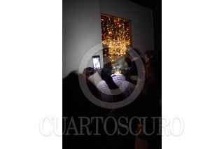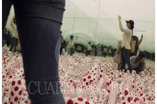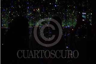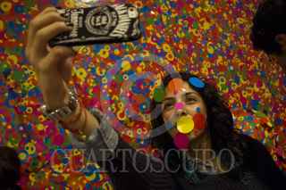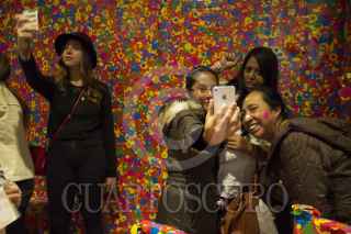 MEXICO, D.F., 17ENERO2015.- A pesar del clima frío que se sintió en la ciudad durante la mañana, cientos de capitalinos se formaron desde tempranas horas para conseguir una boleto de entrada al maratón de la muestra Obsesiòn Infinita, de la artista japonesa Yayoi Kusama, misma que termina este fin de semana. Las entradas para la muestra se agotaron alrededor del medio día, por lo que muchos decidieron hacer filas desde hoy para comprar boletos mañana a primera hora. En la imgen, una joven se toma una "selfie" en la última sala de la exposición. FOTO: DAVID POLO /CUARTOSCURO.COM