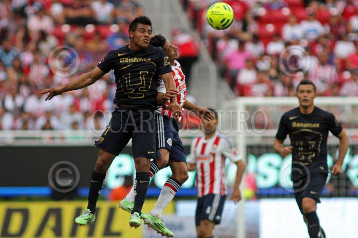 ZAPOPAN, JALISCO. 18ENERO2015.- En la imagen el jugador del Guadalajara Isaac Brizuela disputa un balón frente al contrario de Pumas, Josecarlos Van Rankin, esto en partido correspondiente a la Jornada 2 del Torneo Clausura 2015 de la Liga MX en donde el momento el marcador es fue 2-1 a favor del equipo de Chivas. FOTO: FERNANDO CARRANZA GARCIA / CUARTOSCURO.COM