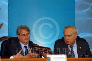MEXICO D.F. 20 MARZO 2006 .- El secretario de la Embajada Francesa Alan Legourrierec y el presidente de la Comisión Nacional del Agua, Cristobal Jaime Jacques, ratificaron un acuerdo entre los gobiernos de Francia y México para compartir políticas y estrategias hidráulicas, durante el IV Foro Internacional del Agua en el Centro Banamex. FOTO:Carlos Guzmán/CUARTOSCURO.COM
