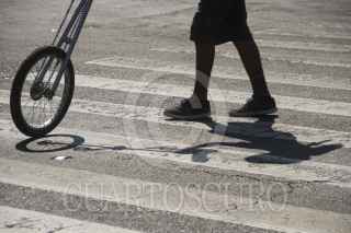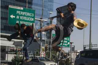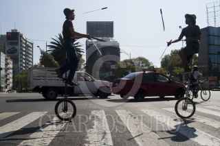 MÉXICO, D.F., 24ENERO2015.- Dos jóvenes trabajando en uno de los cruces peatonales de la ciudad de México, con bicicletas adaptadas por ellos mismo y un juego de cuchillos, cada vez el semáforo permanece en alto, los malabaristas desarrollan un acto para el disfrute de los automovilistas. FOTO: ISABEL MATEOS /CUARTOSCURO.COM