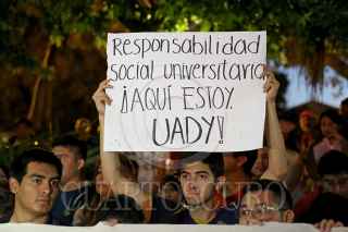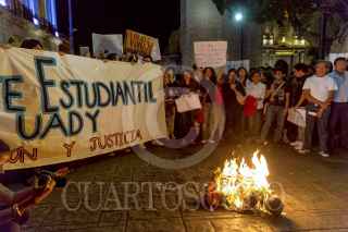 MÉRIDA, YUCATÁN, 26ENERO2015.- Estudiantes universitarios participaron en la protesta convocada por el Frente Estudiantil UADY para exigir sus derechos y piden se acabe la huelga de Universidad Autónoma de Yucatán, además mostraron solidaridad con el caso Ayotzinapa. FOTO: FRANCISCO BALDERAS /CUARTOSCURO.COM
