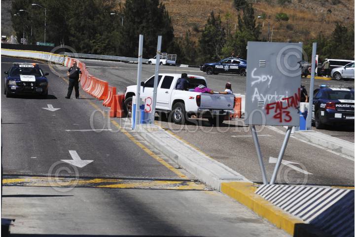 CHILPANCINGO, GUERRERO, 28ENERO2015.-Jóvenes normalistas fueron detenidos cuando intentaban tomar la caseta de cobro de peaje de la Autopista del Sol. En Palo Blanco, se inició una persecución entre policías federales y normalista que a bordo de dos camionetas una tipo picop blanca y una urban, llegaron a la caseta, sin embargo los policías le pararon el alto apuntándelos con un arma corta. El saldo fue de 14 jóvenes detenidos, entre ellos dos mujeres. Los normalistas fueron en llevado a las instalaciones de la Policía Federal con sede en Chilpancingo en avenida de la Juventud , donde se congregaron sus compañeros y maestros de la Ceteg, para pedir su libertad, que se dio después de hora y media de espera. FOTO: JOSÉ I. HERNÁNDEZ / CUARTOSCURO.COM